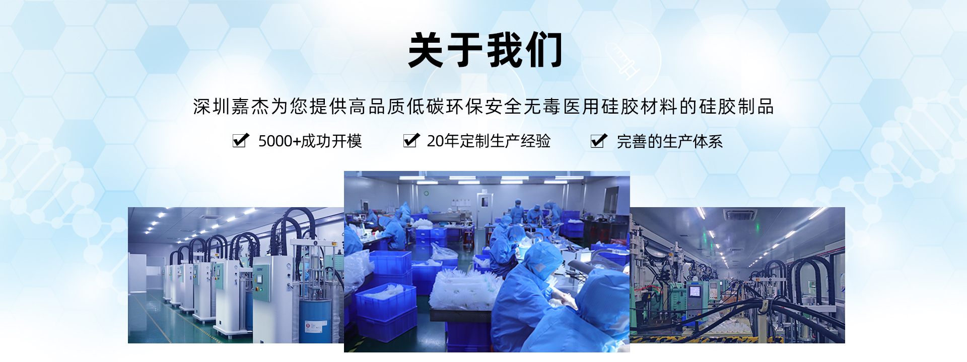 深圳市嘉杰橡塑有限公司是廣東深圳地區(qū)專業(yè)集生產(chǎn)、研發(fā)為一體的硅膠制品生產(chǎn)廠家,主營硅膠管、醫(yī)用硅膠管、醫(yī)用硅膠制品、液態(tài)硅膠制品、發(fā)泡硅膠制品、硅膠密封制品等各大系列硅膠產(chǎn)品,擁有十萬級潔凈車間、液態(tài)無塵車間、模壓車間、擠出車間,現(xiàn)代化的精密機(jī)器設(shè)備和一體化的科技生產(chǎn)線,廠房面積6000余平方米,60噸/月產(chǎn)能,硅膠產(chǎn)品20余年研發(fā)生產(chǎn)經(jīng)驗(yàn),用產(chǎn)品說話,用實(shí)力證明,竭誠為您服務(wù)。