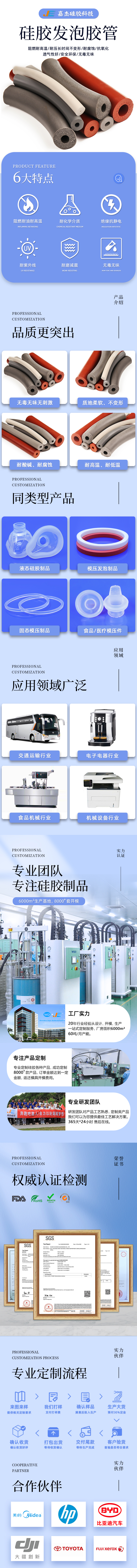 由于硅膠發(fā)泡管應(yīng)用在許多不同的產(chǎn)品上,所要求的規(guī)格也各不同,深圳市嘉杰橡塑有限公司可根據(jù)您的需求