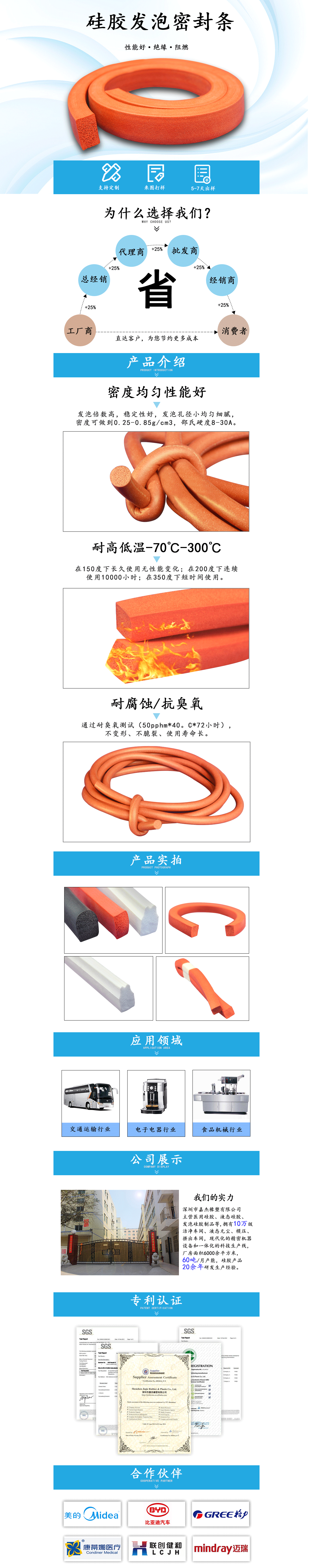 ![]() 長方形硅膠發(fā)泡密封條: 硅膠發(fā)泡條是用獨特配方工藝生產(chǎn)的保溫管,耐高溫250度,耐低溫零下50度,具有很好的隔音阻熱效果,是理想的密封隔熱材料,質(zhì)地為海綿體較柔軟,密度高,表面結(jié)皮光滑,耐老化使用壽命長。 長方形硅膠發(fā)泡密封條性能:1.輕便、強韌性輕便并且具有較強的韌性; 2.隔熱性導熱性低,具有優(yōu)越的保溫性; 3.非吸水性具有獨立氣泡結(jié)構(gòu),吸水性很低; 4.緩沖性抗沖性能極佳,可用作緩沖材料; 5.耐候性耐候性極佳。 長方形硅膠發(fā)泡密封條用途: 長方形硅膠發(fā)泡密封條主要用于配套電器、電子、家具設備、玩具、五金、醫(yī)療設備、體育用品、音響、燈飾、機械、汽車、瓶罐密封、建筑幕墻密封等行業(yè)。 |
