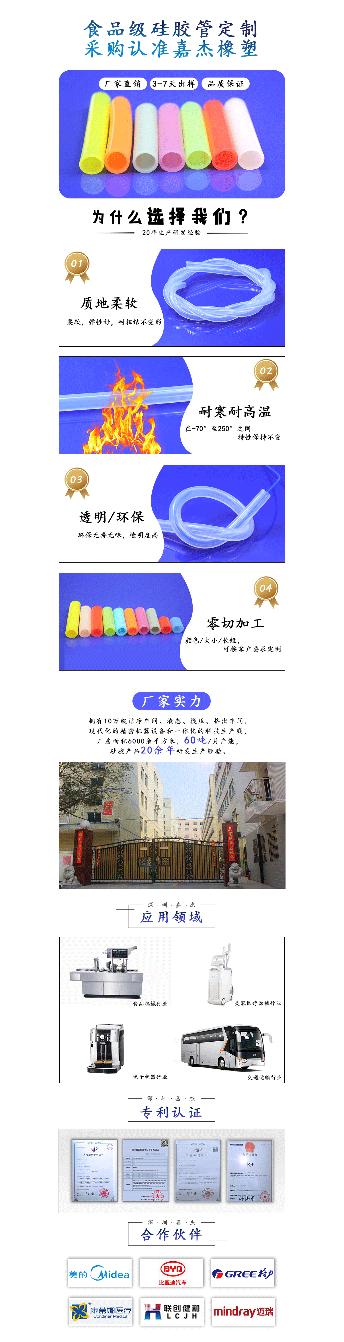 食品級(jí)硅膠管是采用高透明高拉力氣相硅膠為原材料,利用科學(xué)的生產(chǎn)工藝,采用間歇法進(jìn)行生產(chǎn) 1.無(wú)毒,無(wú)氣味,透明度高; 2.柔軟,彈性好,耐扭結(jié)不變形,抗撕拉強(qiáng)度高; 3.耐氧化,耐臭氧,可陽(yáng)光直射,久用不開(kāi)裂,使用壽命長(zhǎng),耐寒耐高溫; 4.符合食品藥品檢測(cè)標(biāo)準(zhǔn),常溫放置不變黃,不噴霜,不吐白,不退色,久置水中無(wú)水垢,無(wú)異味 彩色食品級(jí)硅膠管用途: 彩色食品級(jí)硅膠管廣泛用于醫(yī)藥設(shè)備連接管路,導(dǎo)管,嬰兒奶瓶吸管,導(dǎo)管等;電器儀器等套管,食品類(lèi)用管制品,
